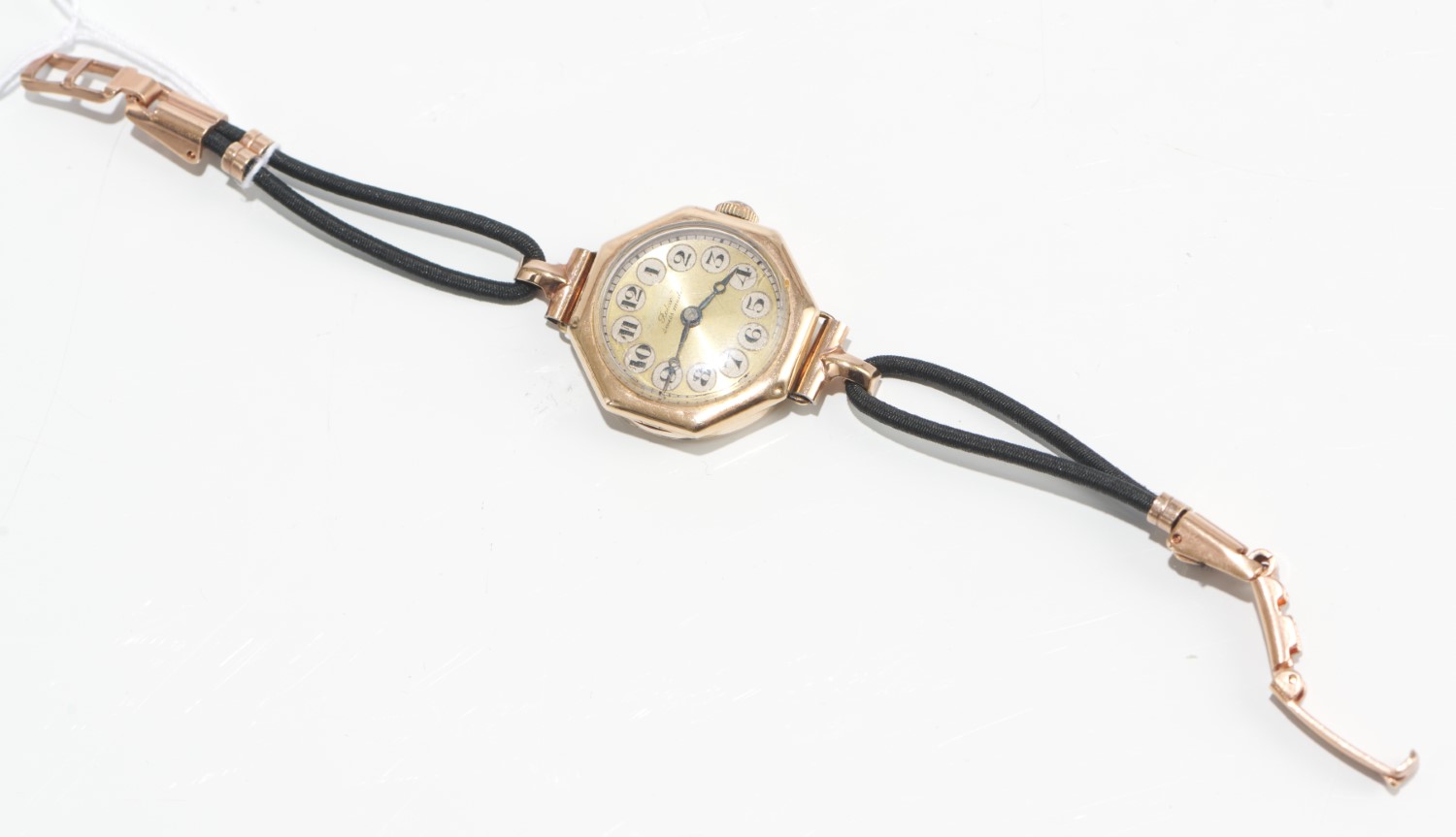 A VINTAGE LADIES MANUAL WIND ROLEX WRISTWATCH WITH BLACK MATERIAL BANDS TO A 9CT GOLD CLASP