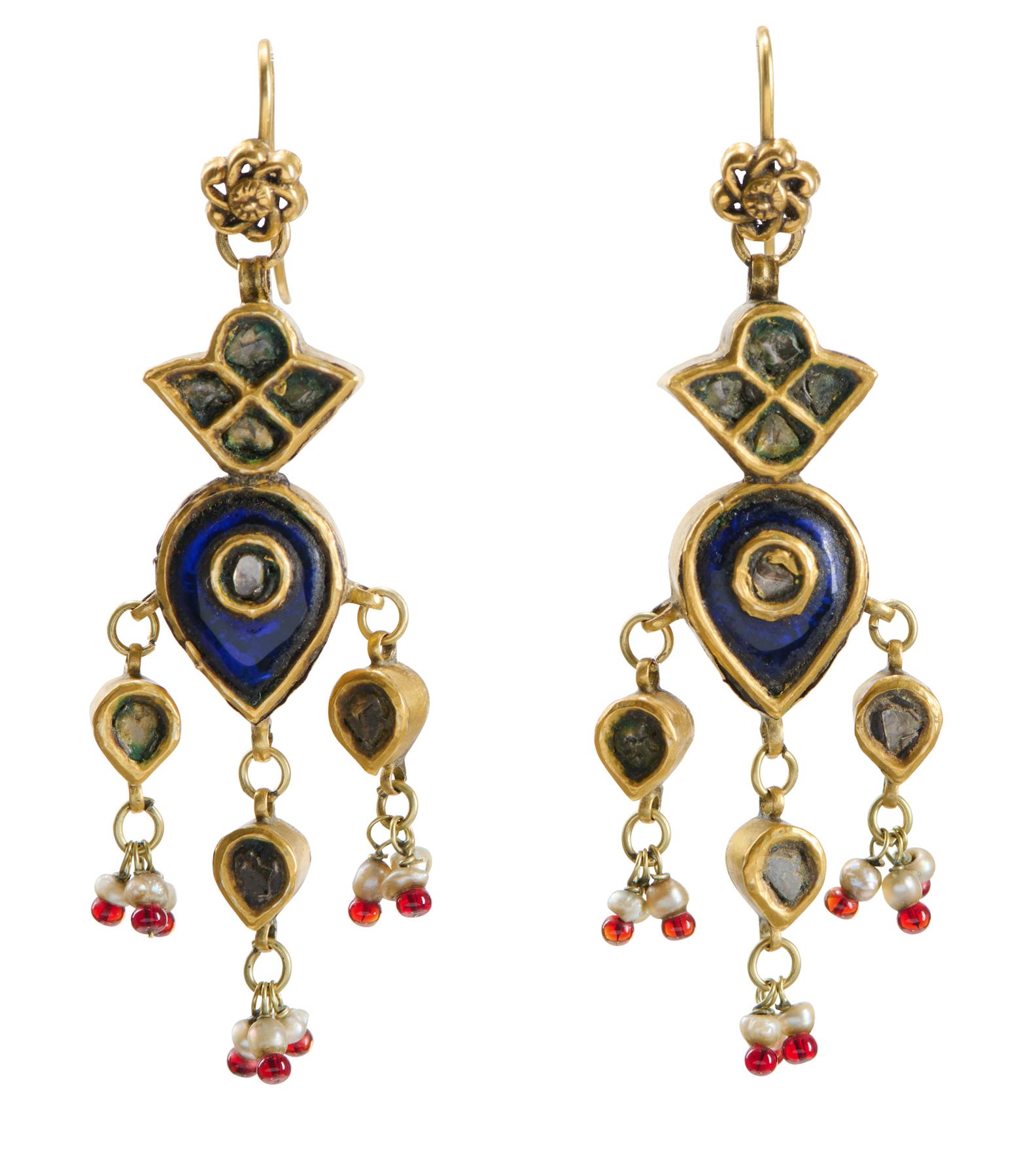 Each earring composed of a pear shape blue enamel drop, suspending three seed pearl and garnet tassels, detailed throughout with kundan-set diamonds, length 55mm, total weight approximately 12.45 grams.