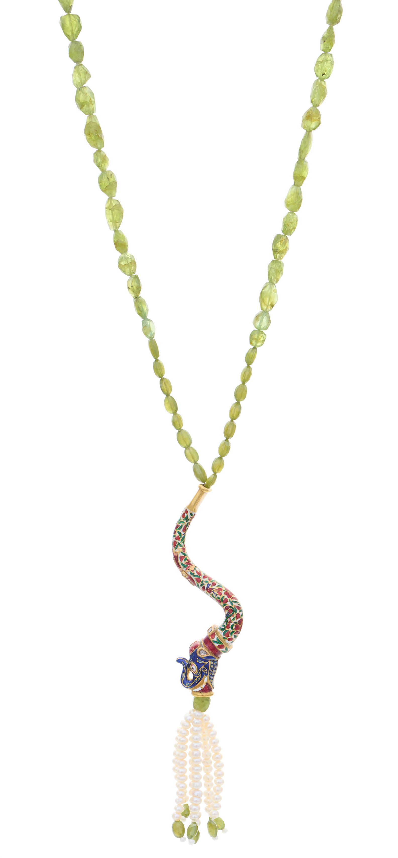 Composed of an enamel and kundan-set diamond set pipe in the form of an elephant, suspending a six tassels of cultured pearls each terminating in a peridot bead, length 100mm, to a round and rough cut peridot necklace completed by s-hook clasp, length 840mm.