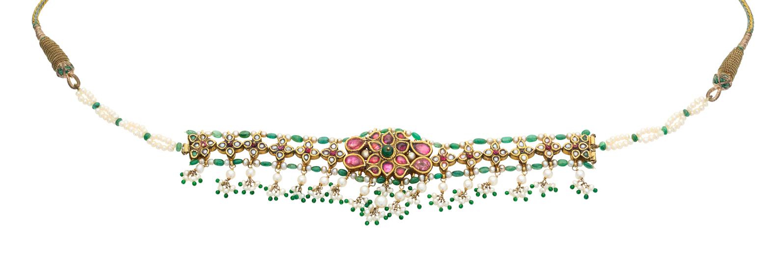 AN ANTIQUE 18CT GOLD, RUBY, EMERALD AND PEARL NECKLACE, EARLY 20TH CENTURY, RAJASTHAN