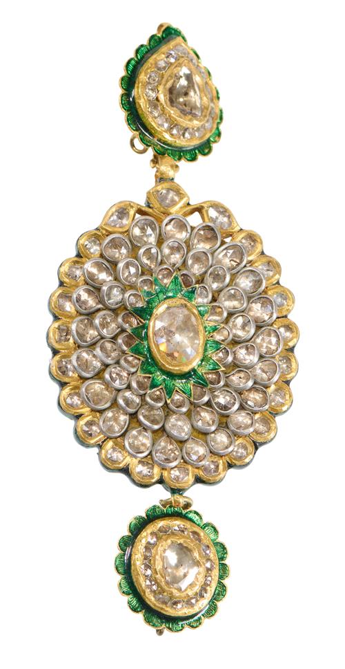 Of cluster design, centring a rose-cut diamond within a surround of green enamel, to stepped concentric rows of further rose-cut diamonds, to a similarly set surmount and suspending a similarly set pendant, with floral and foliate style enamel to reverse, length 95mm, weight 48.6 grams.