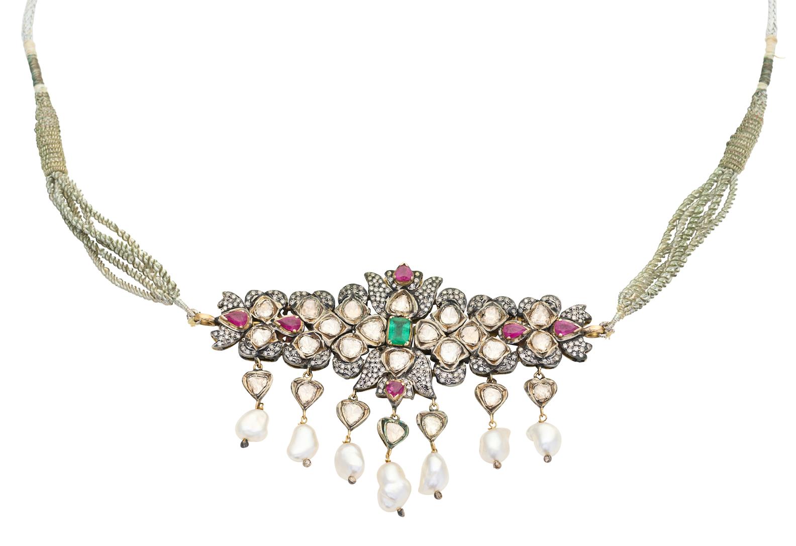 Centring an emerald-cut emerald weighing approximately 0.90 carats, within a surround of kundan-set and pavé-set diamonds, with six pear-cut ruby accents, suspending seven kundan-set diamond and baroque pearl drops, to a woven silk cord, length 660mm adjustable.