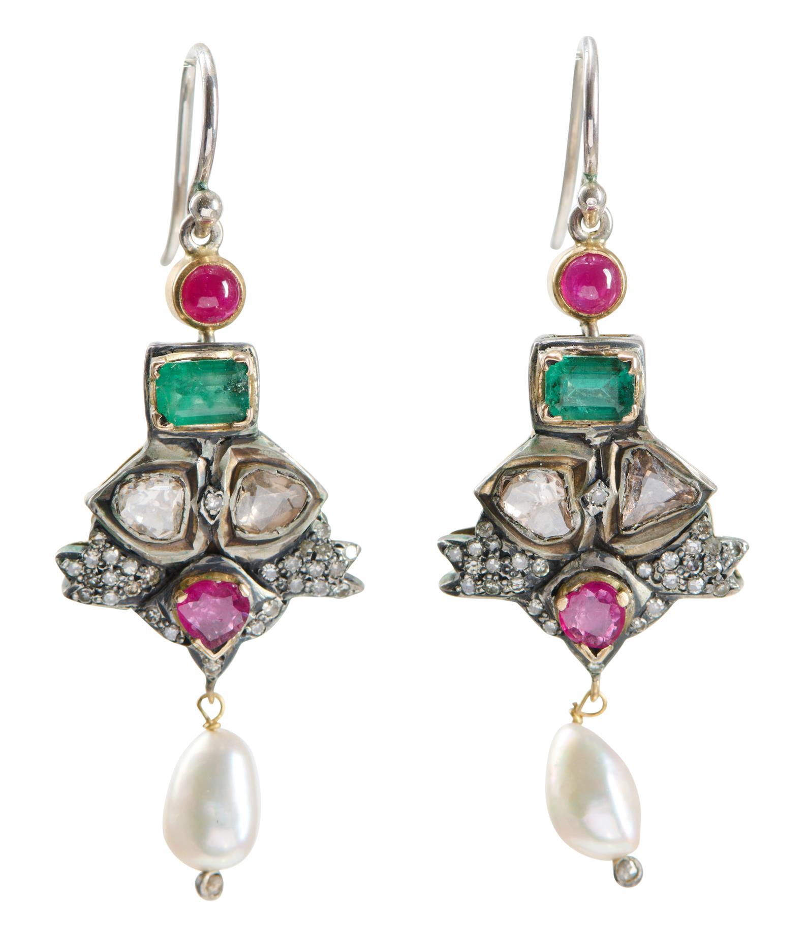 Each earring composed of an emerald-cut emerald weighing approximately 0.25 carats, within a ruby, kundan-set and pavé-set diamond, suspending a drop-shaped pearl, to shepherd hook fittings, length 50mm.