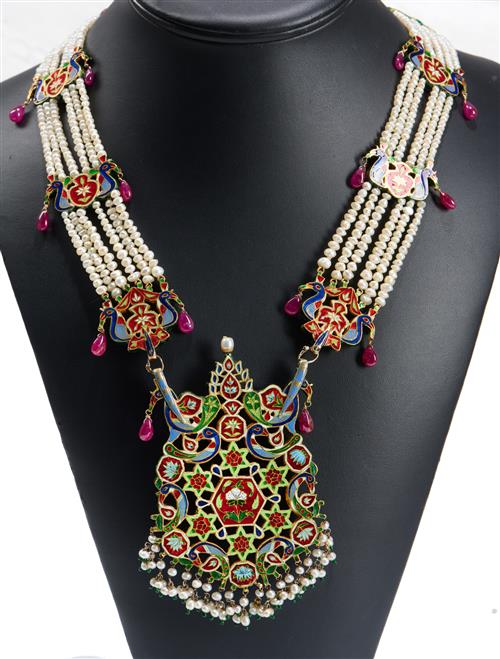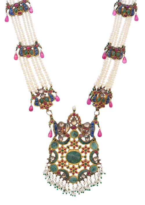 Centring an openwork pendant composed of carved emeralds, enamel and kundan-set diamonds, suspending seed pearl tassels, pendant length 110mm, to a multi-strand cultured pearl necklace, set at intervals with double bird motifs detailed with multi-coloured enamel and kundan-set diamonds, each suspending tumbled ruby drops, to a later clasp in 14ct gold, length 520mm.