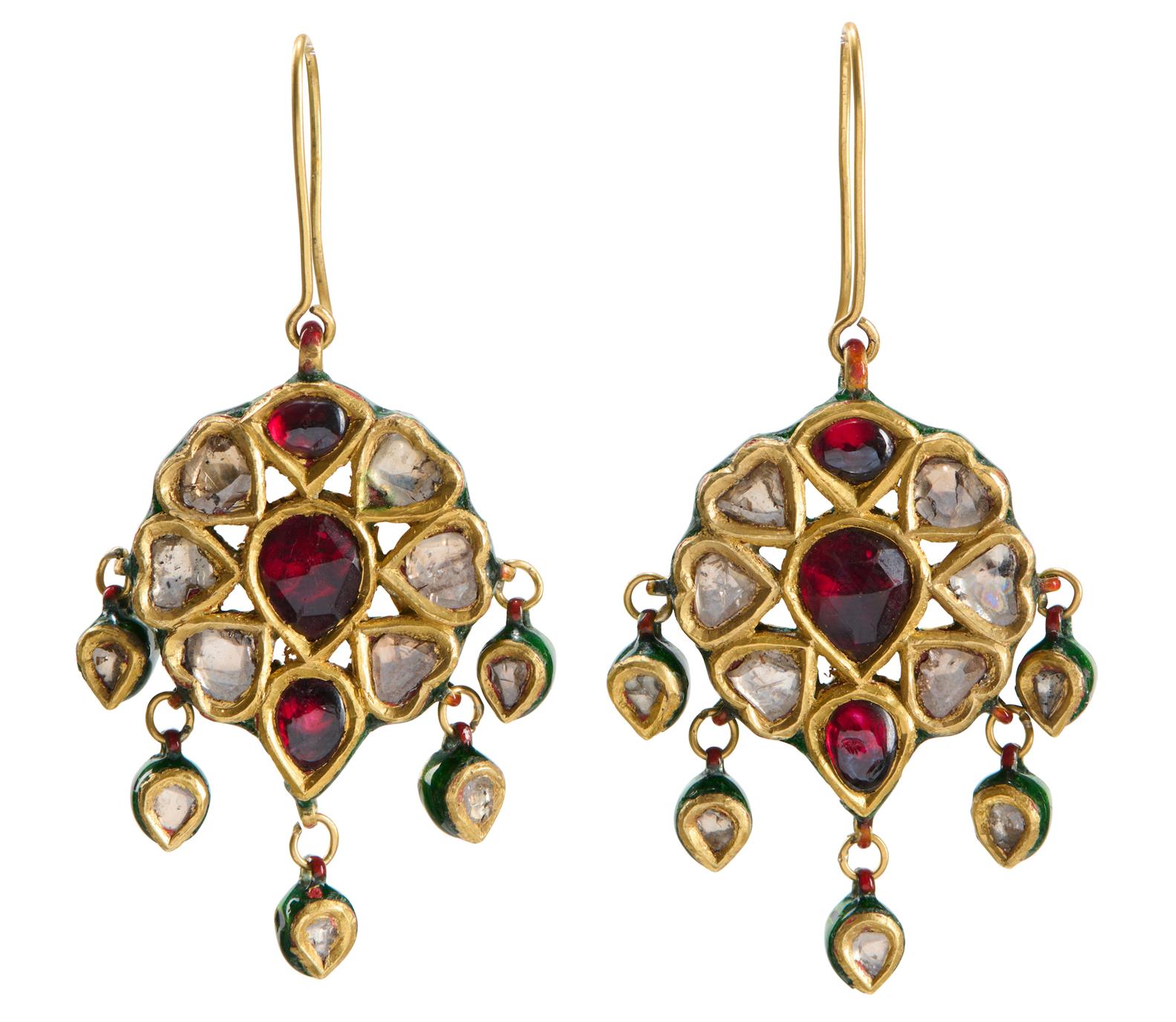 Each earring composed of a red enamel and kundan-set diamond cluster, suspending five further diamond drops, floral and foliate enamel to reverse, to shepherd hook fittings in 9ct gold, length 62mm, weight approximately 21.9 grams.