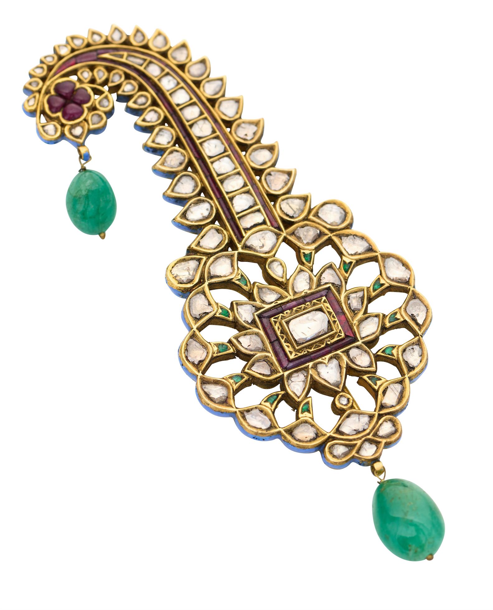A 22CT GOLD MUGHAL STYLE GEM-SET GOLD HAIR ORNAMENT