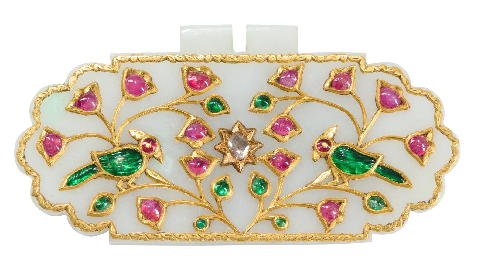 The wide jadeite and gold plaque, centring a kundan-set diamond, flanked by birds detailed with red and green enamel, perched upon branches detailed with cabochon rubies and enamel, measuring 100mm by 50mm.