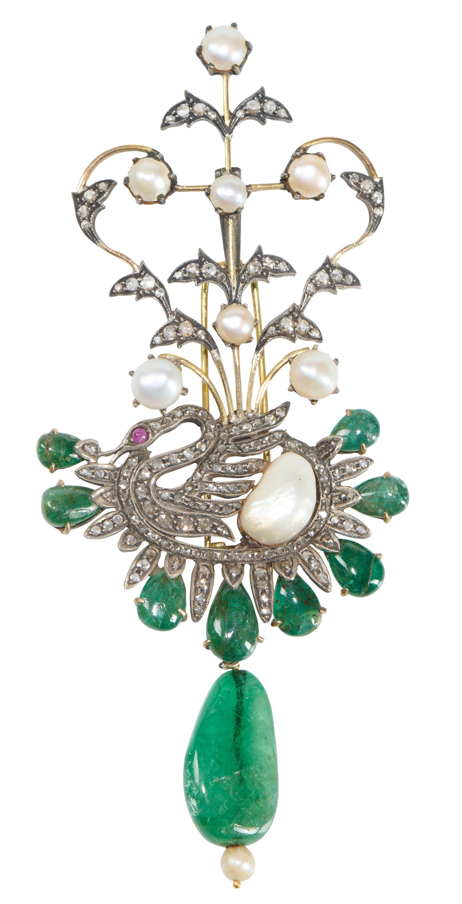Centring a baroque pearl and rose-cut diamond swan motif with cabochon ruby eye, with tumbled emerald border and suspending a tumbled emerald pendant, all below a cultured pearl and rose-cut diamond open work surmount, measuring 130mm by 55mm.