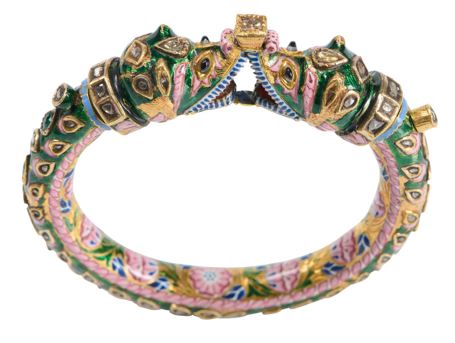 The circular hinged bangle, centring two Makara heads, detailed throughout with kundan-set diamonds and enamel, inner diameter 60mm.