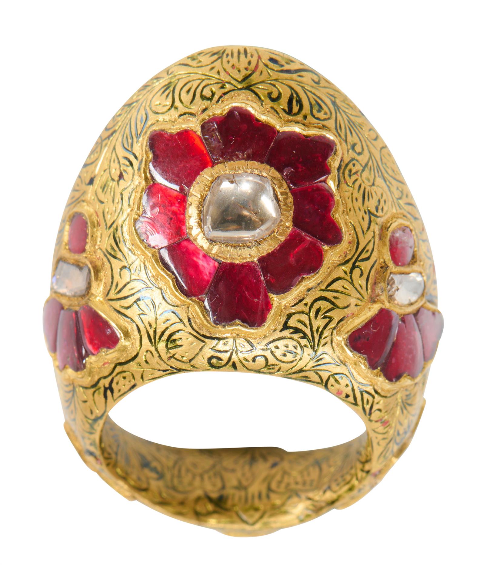 Detailed with kundan-set diamonds and red enamel cluster decoration, in a finely enamelled surround, ring size W-X, weight approximately 26 grams.