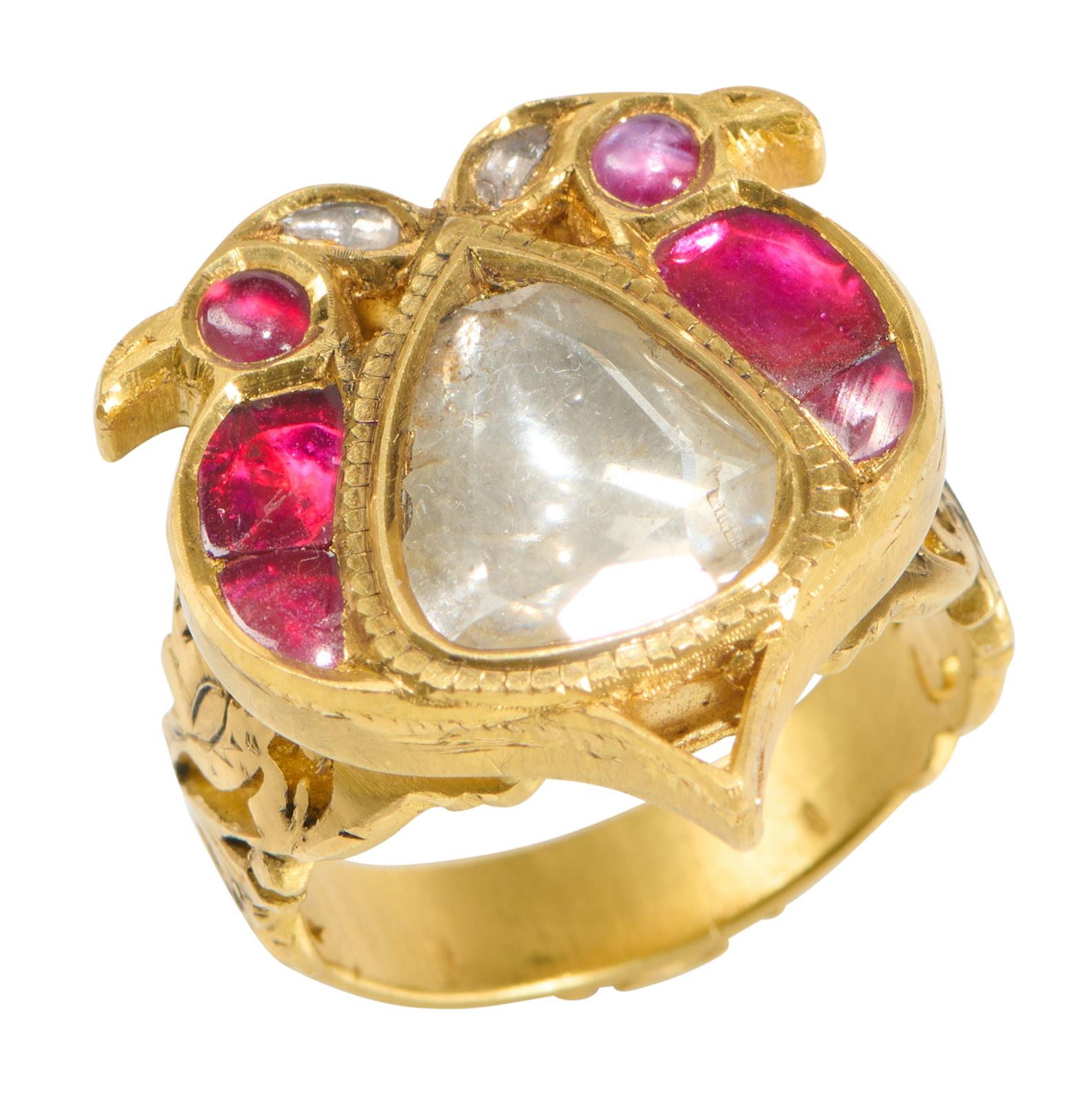Centring a kundan-set pear-shaped diamond, flanked by pink enamel, to an openwork band, ring size O, weight approximately 14.3 grams.