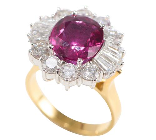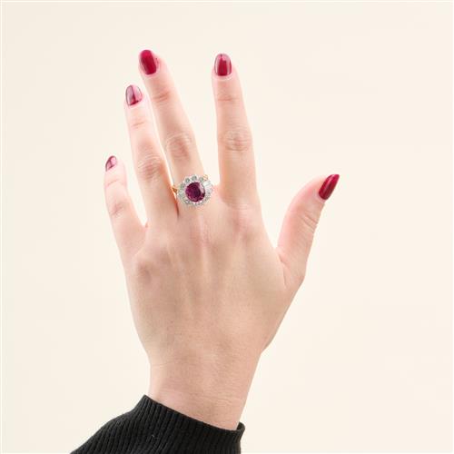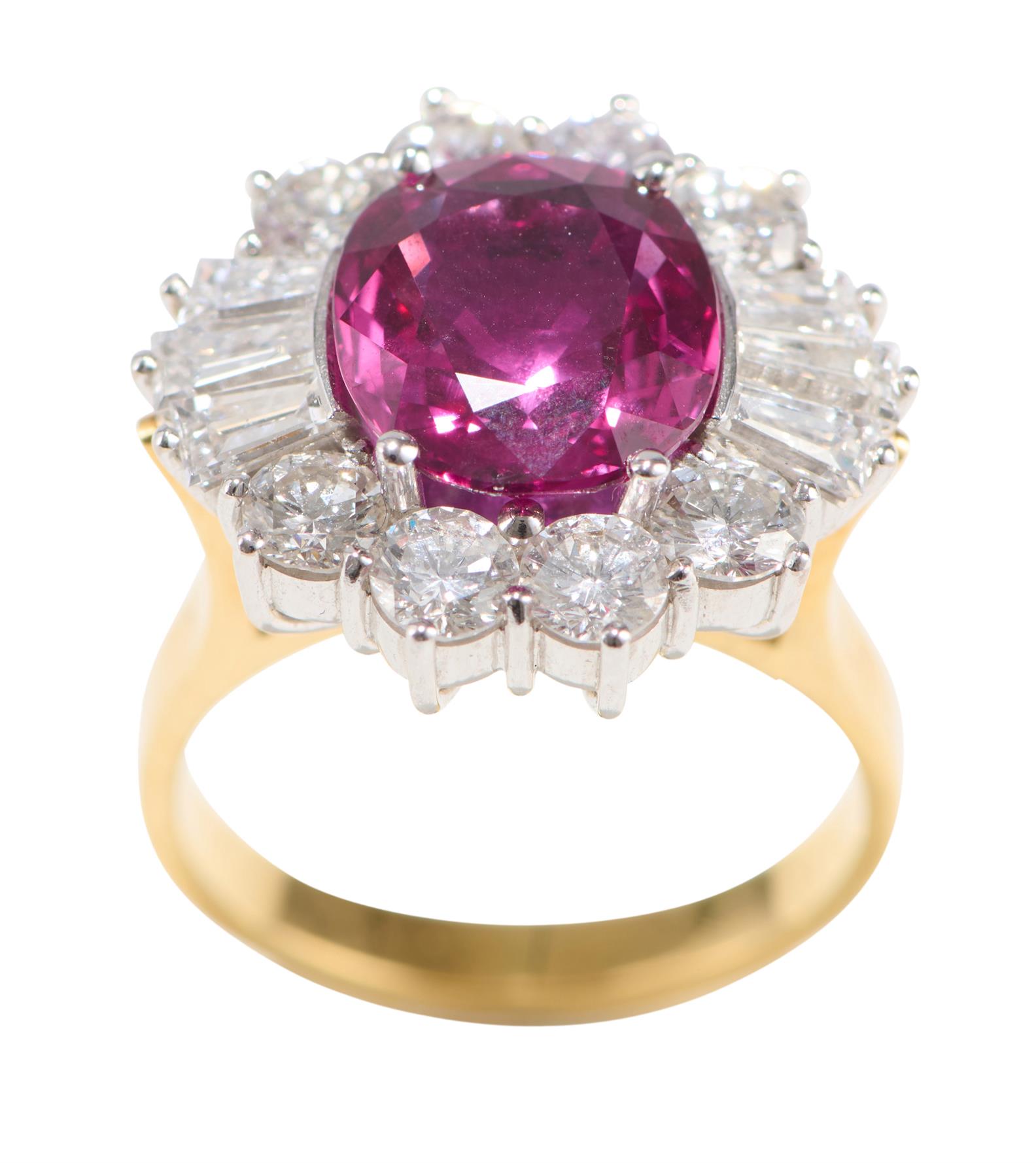Centring an oval-cut ruby weighing 2.80 carats within a surround of baguette and round brilliant-cut diamonds totalling 1.94cts, ring size K.