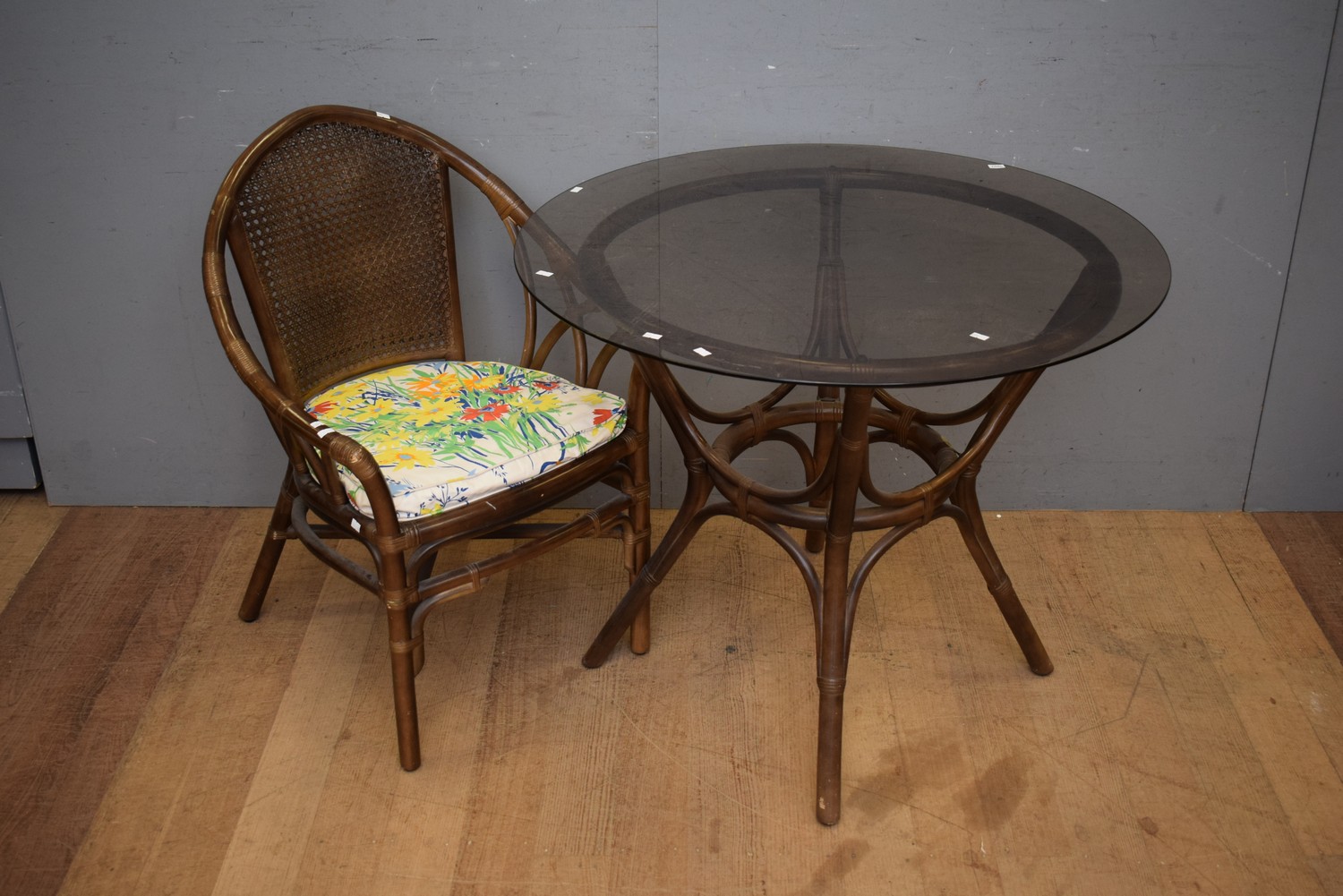 AN OUTDOOR SETTING COMPRISING GLASS TOP TABLE AND ARMCHAIR (73H x 93D CM) (LEONARD JOEL DELIVERY SIZE: LARGE)
