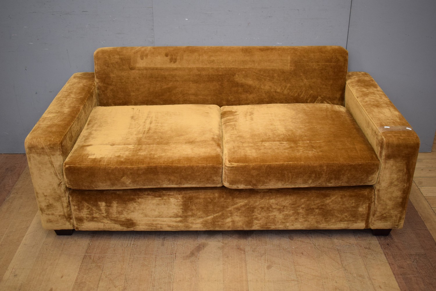 A COMTEMPORARY GOLD VELVET TWO SEATER SOFA (A/F) (69H x 174W x 91D CM) (PLEASE NOTE THIS HEAVY ITEM MUST BE REMOVED BY CARRIERS AT THE CUSTOMER'S EXPENSE. LEONARD JOEL STAFF CANNOT ASSIST CARRYING THIS ITEM) (X-LARGE ITEM)