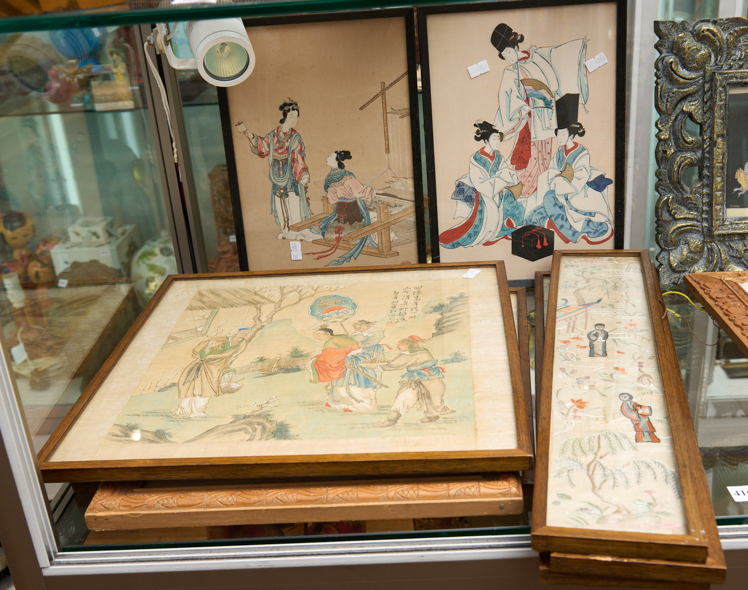 A SMALL BOX OF ORIENTAL PICTURES INCL. EMBROIDERY, AND A LITHOGRAPH OF A YOUNG GIRL, LEONARD JOEL LOCAL DELIVERY SIZE: SMALL