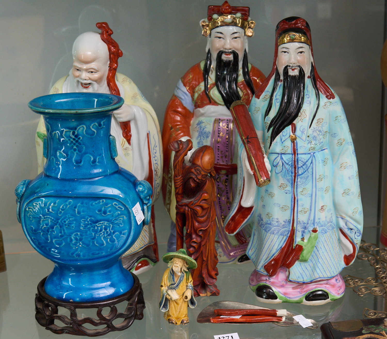 A SMALL GROUP OF ORIENTAL ITEMS INCL. FIGURES, FUK LUK SAO, BLUE VASE, CHINESE SHOE HORN, LEONARD JOEL LOCAL DELIVERY SIZE: SMALL