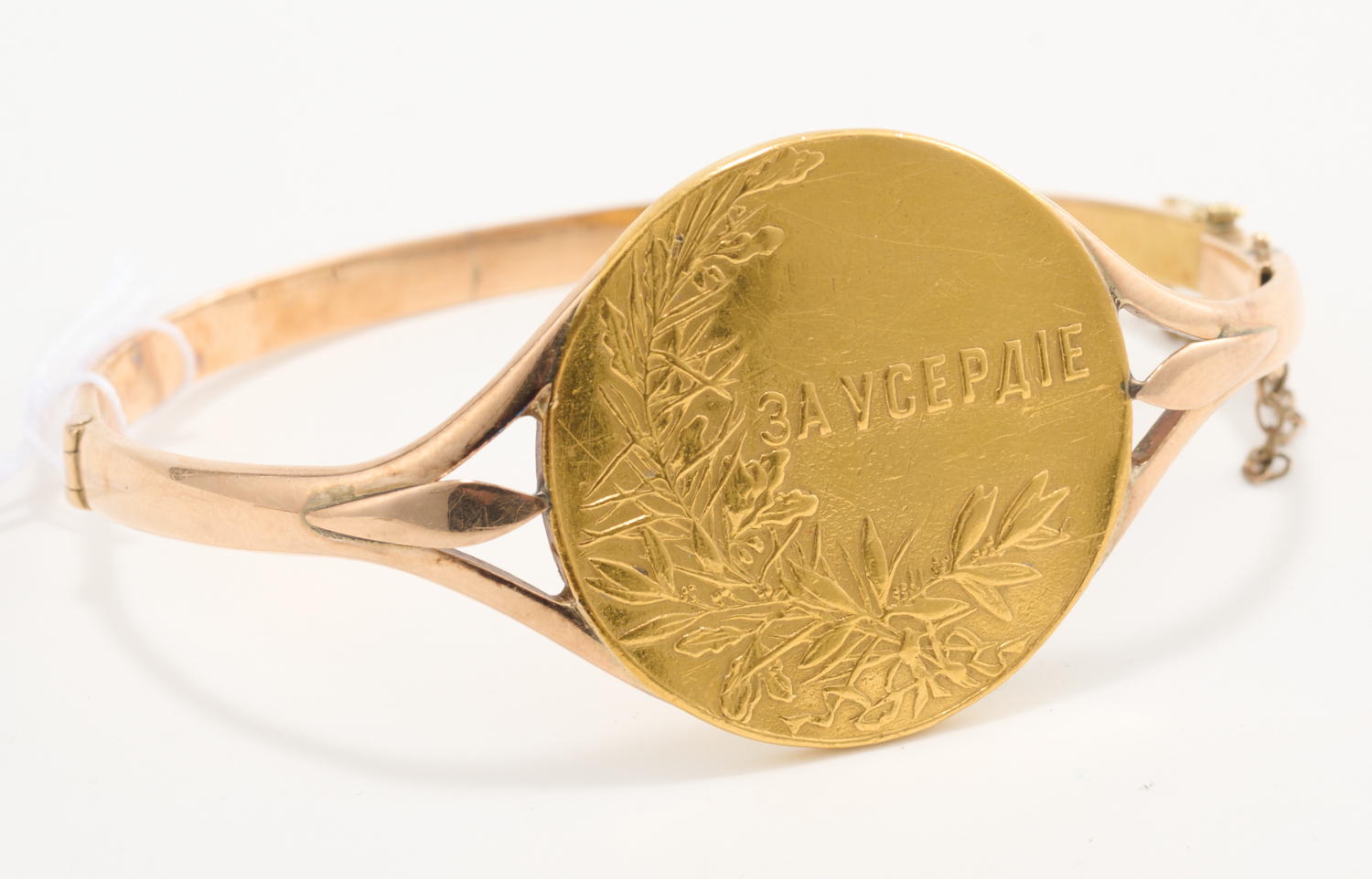 A MEDALLION HINGE BANGLE IN 14CT GOLD, FEATURING A CENTRAL DUAL FACED CZARIST RUSSIAN COIN IN 22CT GOLD, 35.9GMS