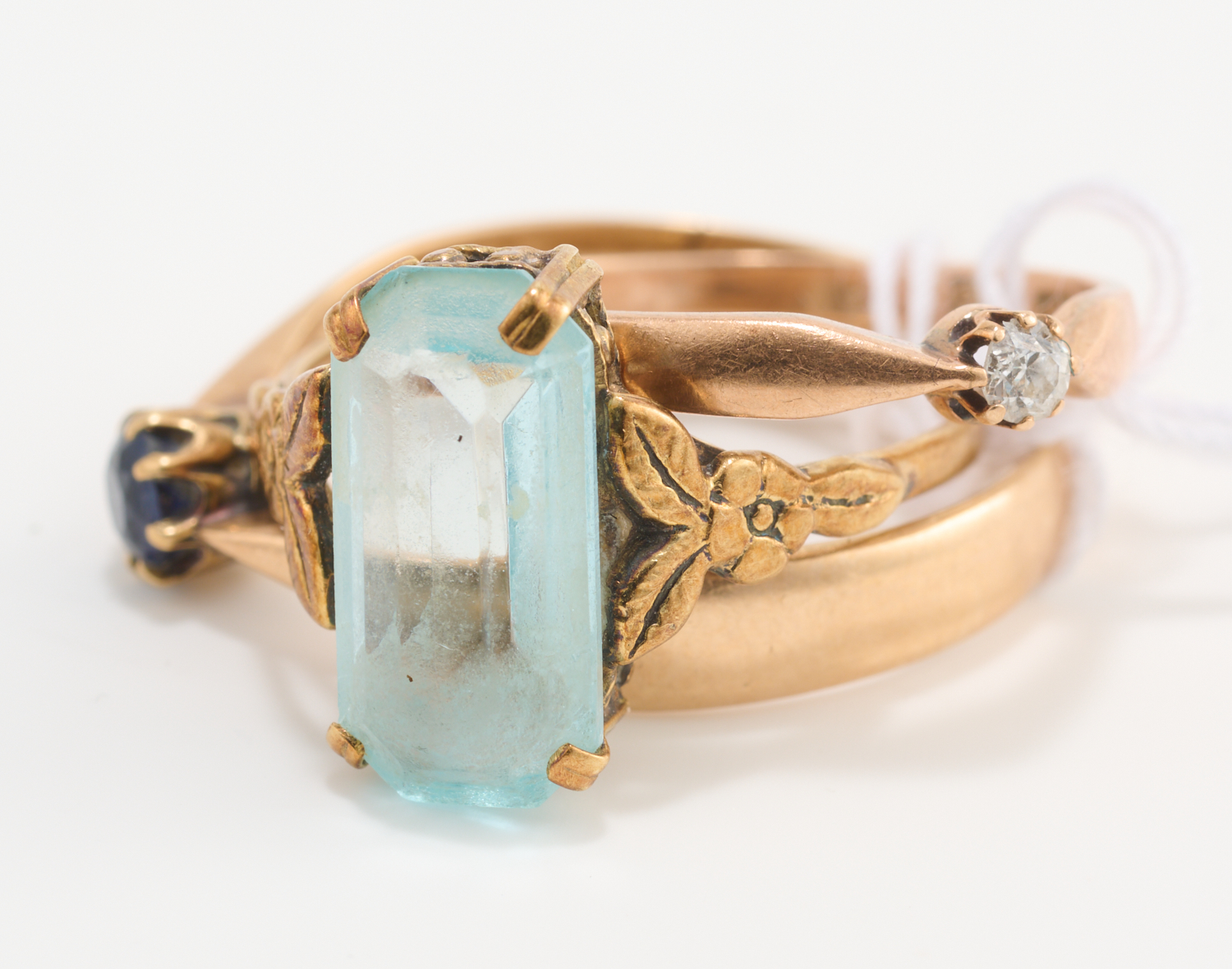 THREE ANTIQUE DRESS RINGS IN 14CT GOLD, INCLUDING A SOLITAIRE SAPPHIRE RING (RING SIZE T/U) HALLMARKED, A SOLITAIRE DIAMOND (RING SIZE N), AND AN EMERALD CUT AQUAMARINE (RING SIZE L/M), 5.2GMS