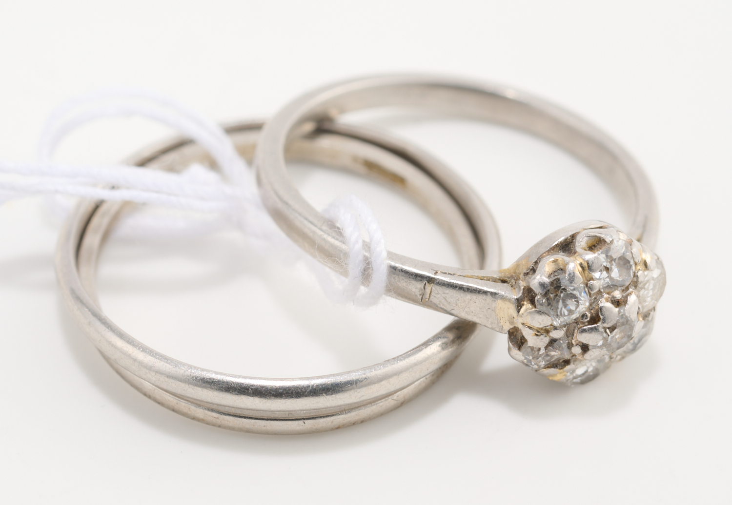 A COLLECTION OF THREE RINGS IN PLATINUM, INCLUDING A DIAMOND SET RING COMPRISING SIX ROUND BRILLIANT CUT DIAMONDS , 6.5GMS