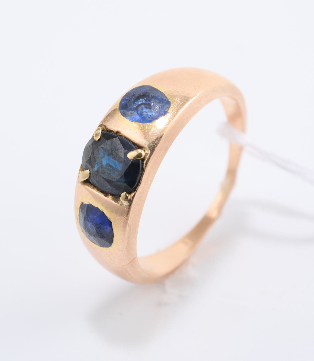 A SAPPHIRE DRESS RING IN 14CT GOLD, FEATURING THREE FLUSH SET SAPPHIRES, RING SIZE O/P, 5.2GMS