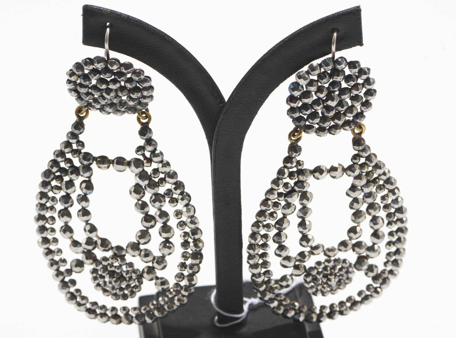 A PAIR OF GEORGIAN CUT STEEL GIRANDOLE EARRINGS, TO SILVER HOOK FITTINGS, LENGTH 85MM, RETAILED BY KOZMINSKY.
