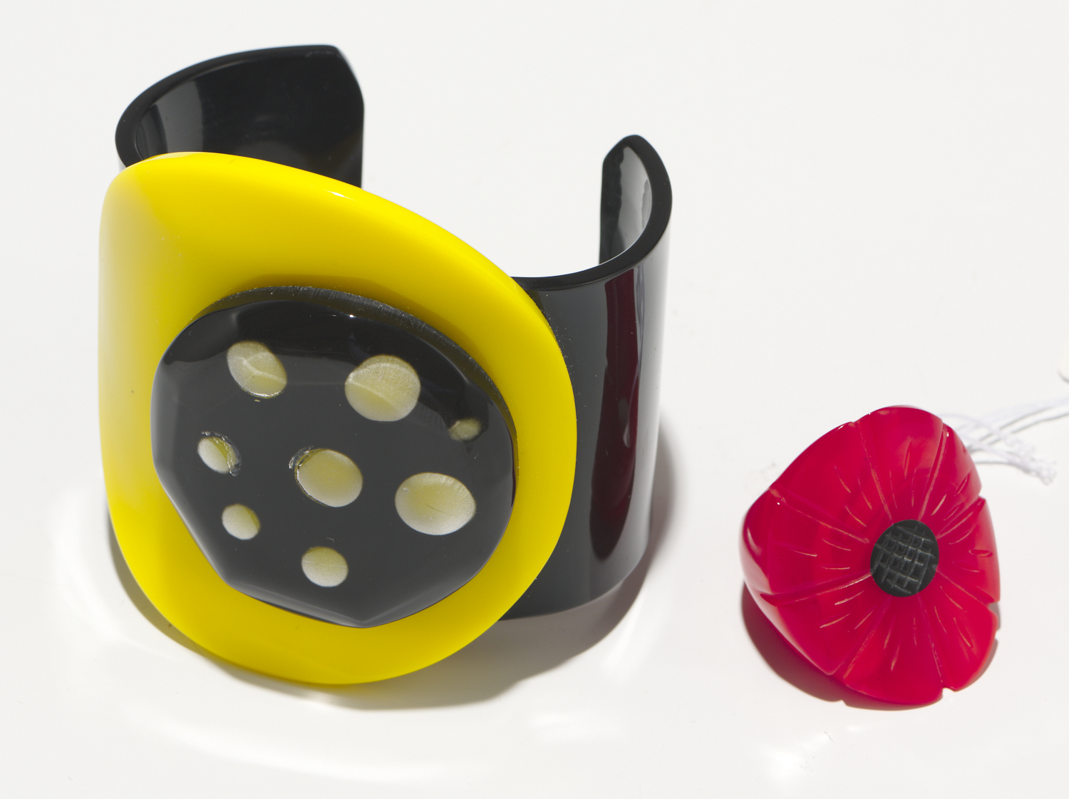 A PLASTIC BLACK AND YELLOW CUFF WITH RED FLOWER RING