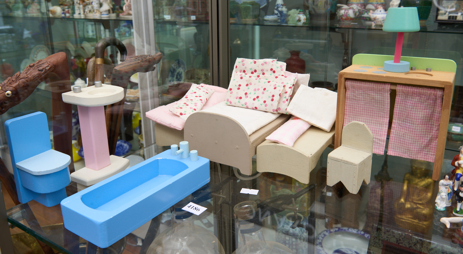 A GROUP OF WOODEN DOLL HOUSE FURNITURE PIECES IN PASTEL COLOURS, LEONARD JOEL LOCAL DELIVERY SIZE: SMALL. The Rodney Permezel Collection