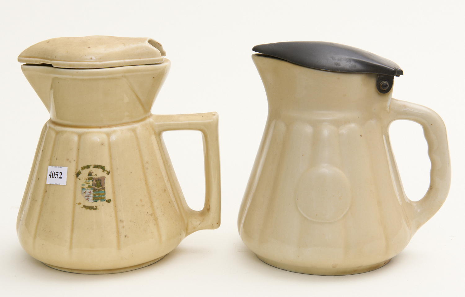 TWO VINTAGE CERAMIC KETTLES, ONE AUSTRALIAN (A/F), LEONARD JOEL LOCAL DELIVERY SIZE: SMALL. The Rodney Permezel Collection