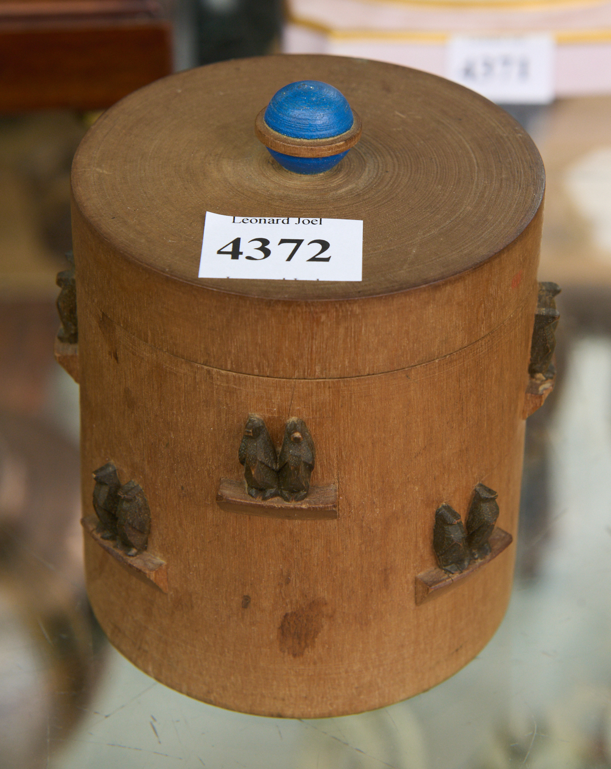 A TURNED TIMBER BOX WITH BIRD DECORATION H.9CM, LEONARD JOEL LOCAL DELIVERY SIZE: SMALL. The Rodney Permezel Collection