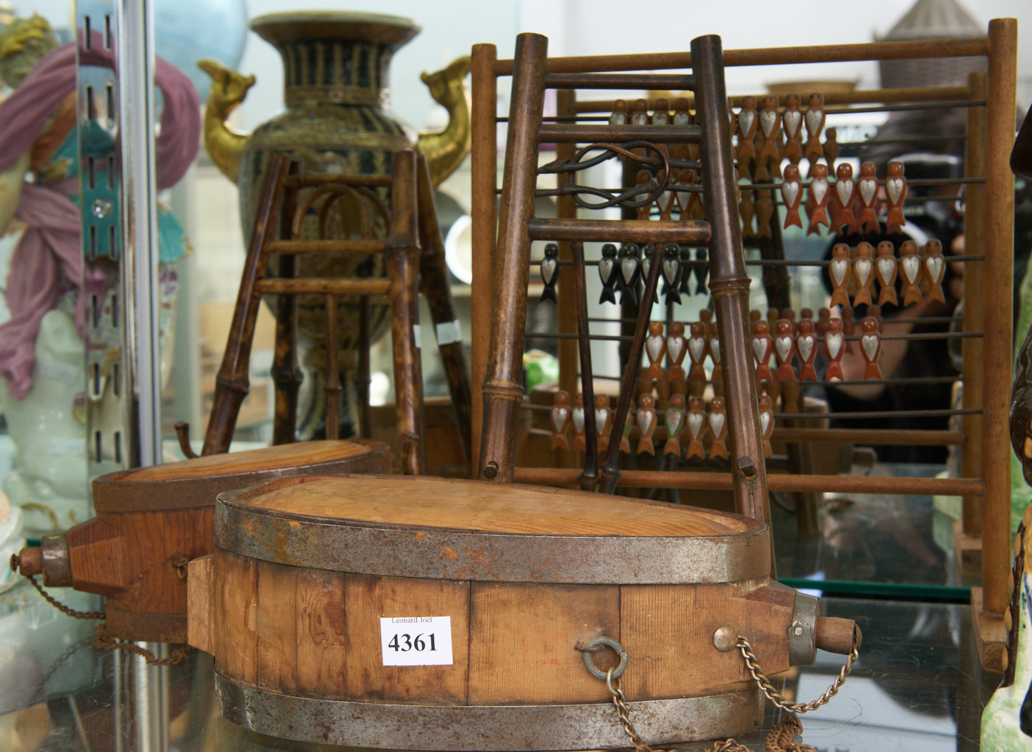 A COLLECTION OF WOODEN WARES INCLUDING ABACUS, BAMBOO PLATE STANDS, ETC, LEONARD JOEL LOCAL DELIVERY SIZE: SMALL. The Rodney Permezel Collection