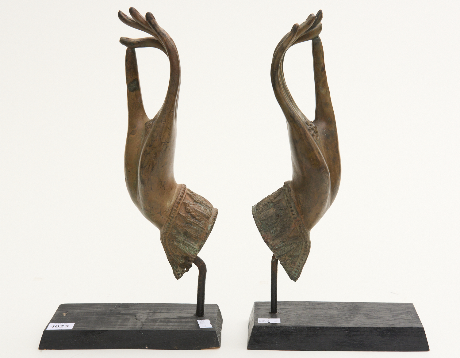 A PAIR OF CAST METAL BUDDHA HANDS ON STANDS H.33CM, LEONARD JOEL LOCAL DELIVERY SIZE: SMALL