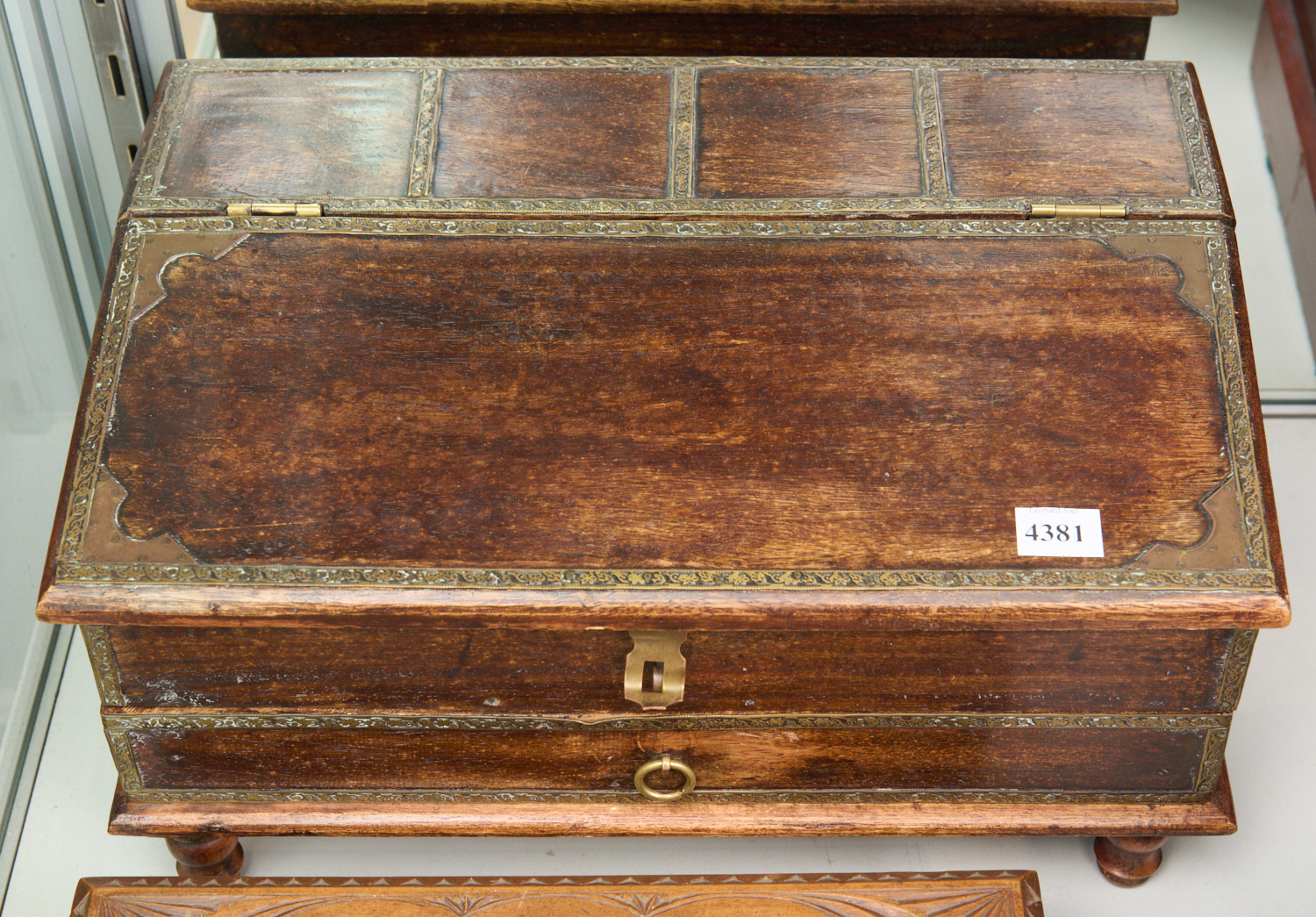 AN OAK BOX WITH BRASS MOUNTS, HINGED TOP OVER SINGLE DRAWER W.37CM, LEONARD JOEL LOCAL DELIVERY SIZE: SMALL