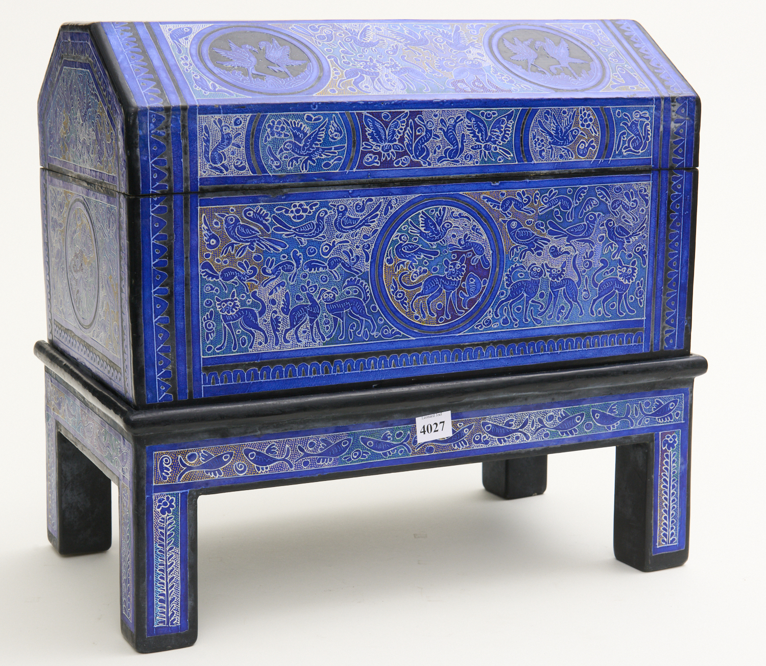 A MEXICAN LACQUERED CHEST WITH CAT AND BIRD MOTIF W.40CM, LEONARD JOEL LOCAL DELIVERY SIZE: SMALL