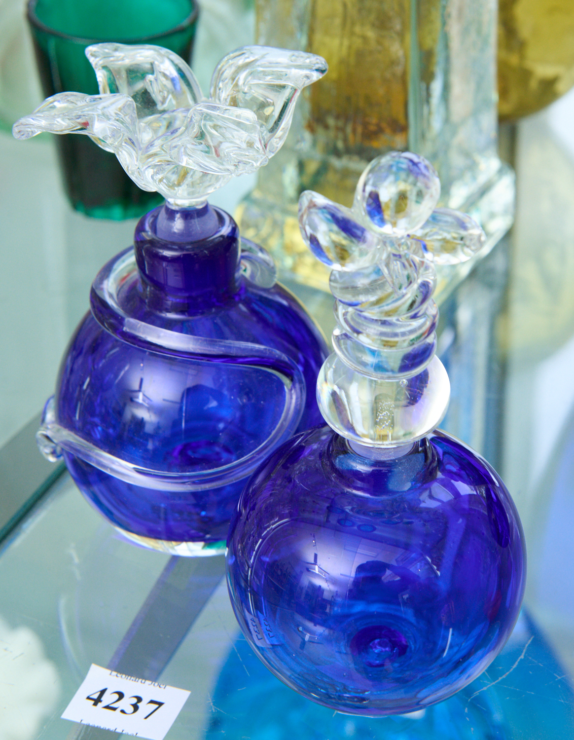 TWO BLUE ART GLASS PERFUME BOTTLES, BOTH SIGNED H.14CM, LEONARD JOEL LOCAL DELIVERY SIZE: SMALL