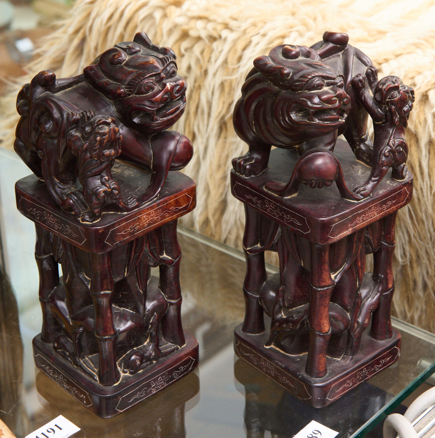 A PAIR OF STONE FOO DOG, BAMBOO AND DEER DECORATED CARVINGS H.20CM, LEONARD JOEL LOCAL DELIVERY SIZE: SMALL