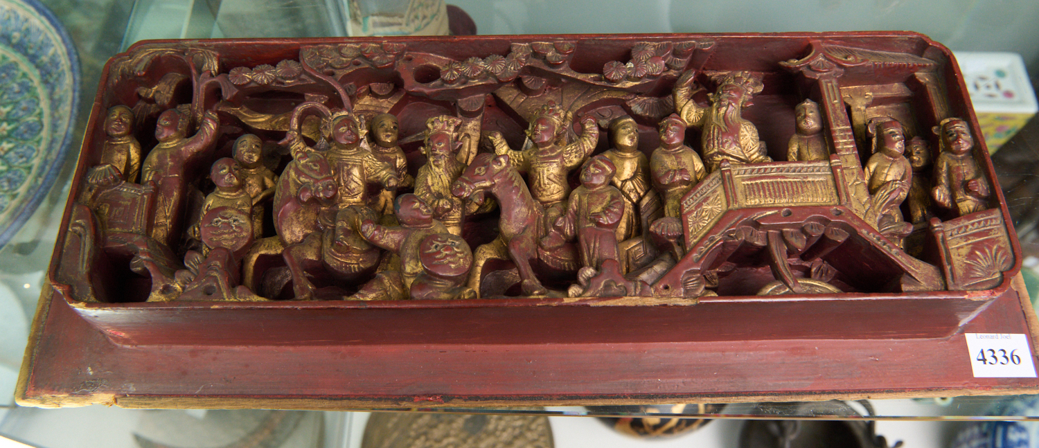 A CHINESE FIGURAL WOODEN CARVING W.40CM, LEONARD JOEL LOCAL DELIVERY SIZE: SMALL