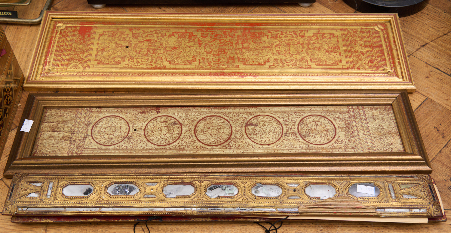 TWO DECORATIVE GILT PANELS TOGETHER WITH PAPYRUS TIBETAIN PRAYER SHEETS (A/F), LEONARD JOEL LOCAL DELIVERY SIZE: SMALL