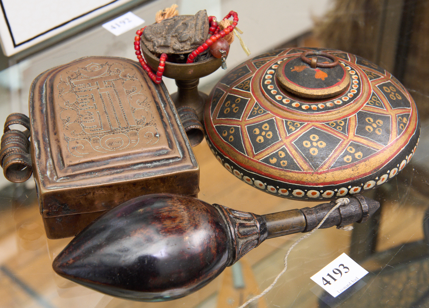 A TIBETAN PRAYER WHEEL TOGETHER WITH LIDDED BOX AND OTHERS, LEONARD JOEL LOCAL DELIVERY SIZE: SMALL