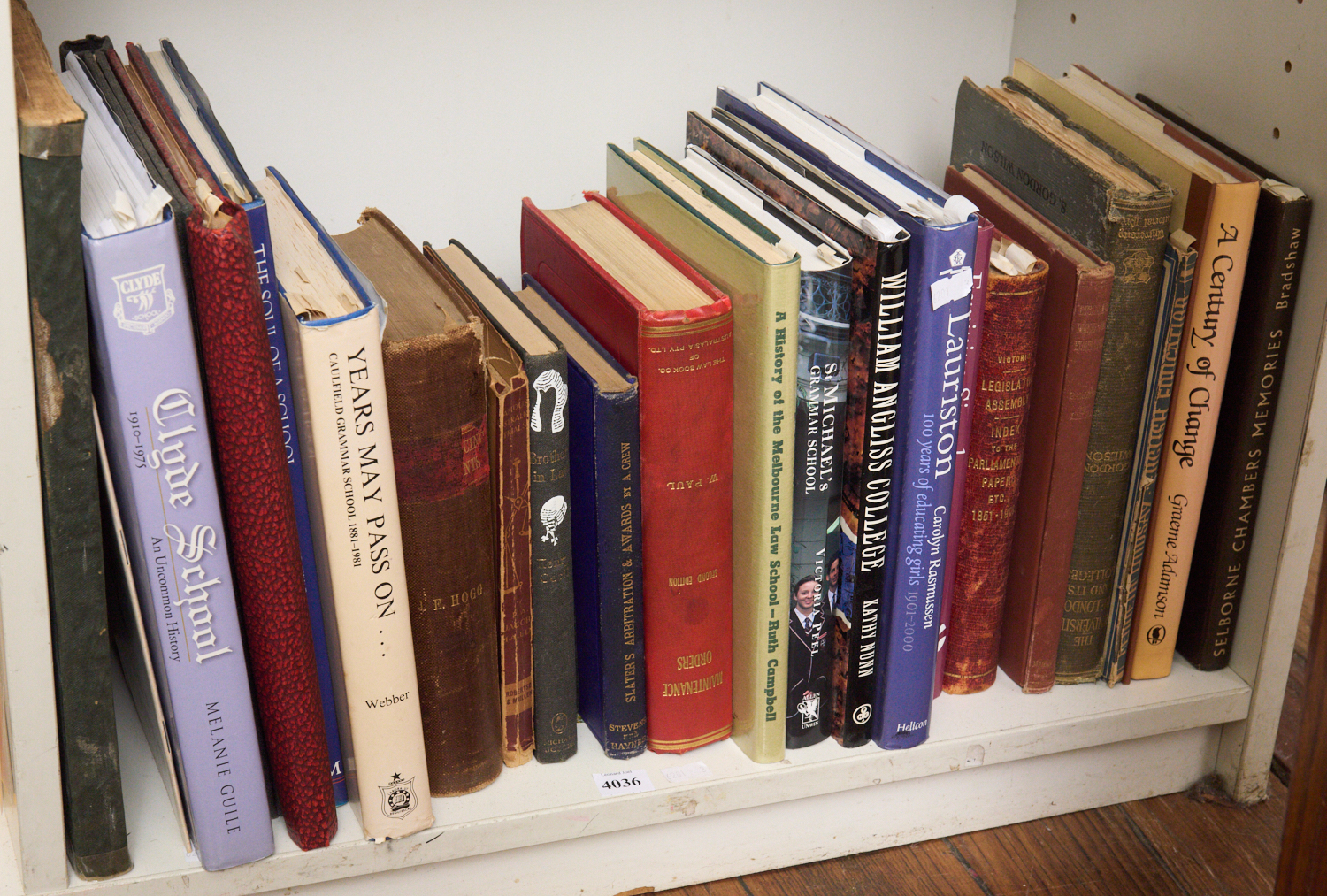 A SHELF OF BOOKS PERTAINING TO LAW AND SCHOOL HISTORY, LEONARD JOEL LOCAL DELIVERY SIZE: SMALL