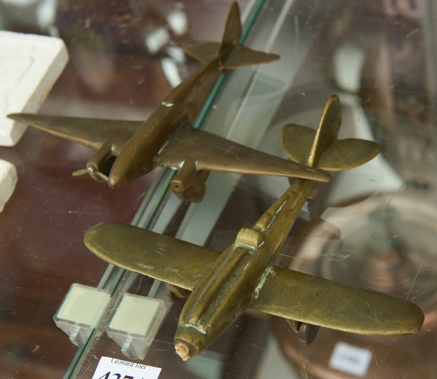 A PAIR OF BRASS DESK ORNAMENT AIRPLANES H.14CM, LEONARD JOEL LOCAL DELIVERY SIZE: SMALL. The Rodney Permezel Collection
