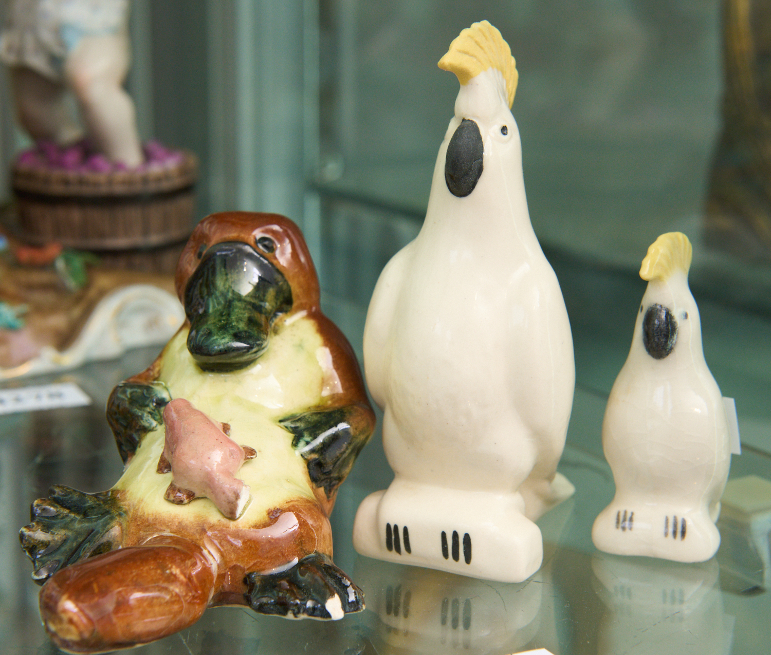 TWO BENDIGO POTTERY COCKATOOS TOGETHER WITH DARBYSHIRE POTTERY PLATYPUS (A/F) H.10CM, LEONARD JOEL LOCAL DELIVERY SIZE: SMALL