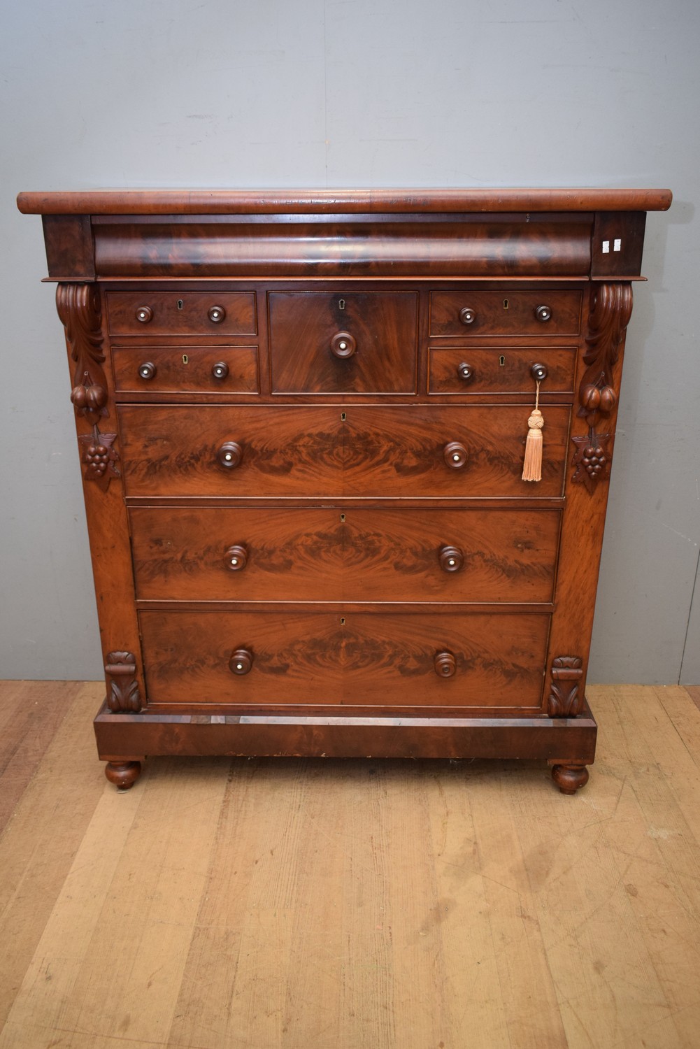 A VICTORIAN FLAME MAHOGANY TEN DRAWER TALLBOY (A/F) ( 149H X 128W X 60D CM) (PLEASE NOTE THIS HEAVY ITEM MUST BE REMOVED BY CARRIERS AT THE CUSTOMER'S EXPENSE. LEONARD JOEL STAFF CANNOT ASSIST CARRYING THIS ITEM) (X-LARGE ITEM)