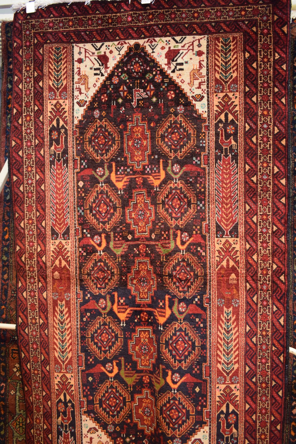 A FINE NEW TRIBAL PERSIAN SANGUN BALOUCH RUG, 100% WOOL. HAND-KNOTTED TRIBAL WEAVE & DESIGN OF ALTERNATING GEOMETRIC & "BIRD-PATTERNED" MEDALLION SET WITHIN A RED FIELD. PALMETTES WITHIN CORNER MEDALLIONS WITH BIRD FORM AND GEOMETRIC PATTERN. MAJOR BORDER PEACOCKS AND TREES. MINOR BORDER OF TRIBAL PATTERNS. GALLERY INVENTORY. IN EXCELLENT CONDITION. CERTIFICATE OF AUTHENTICITY INCLUDED. SIZE: 192X102CM ORIGIN: PERSIA - RRP: $1,800 (LEONARD JOEL DELIVERY SIZE: LARGE)