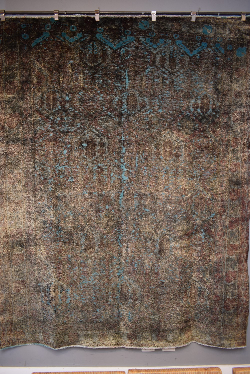 A VINTAGE PERSIAN TABRIZ OVER-DYED CARPET. HAND KNOTTED USING HAND SPUN WOOL ON STRONG COTTON WARPS WITH THE PILE SHORN DOWN. THE RUG IS OVER-DYED IN COLOUR-FAST DYES AND HAND-CARVED TO CREATE UNIQUE PATTERNS. IN TONES OF TURQUOISE, CHARCOAL AND GREEN. AS SEEN IN VOGUE & HOME DÉCOR MAGAZINES. CERTIFICATE OF AUTHENTICITY INCLUDED. SIZE: 279X221CM ORIGIN: PERSIA - RRP: $4,900 (LEONARD JOEL DELIVERY SIZE: LARGE)
