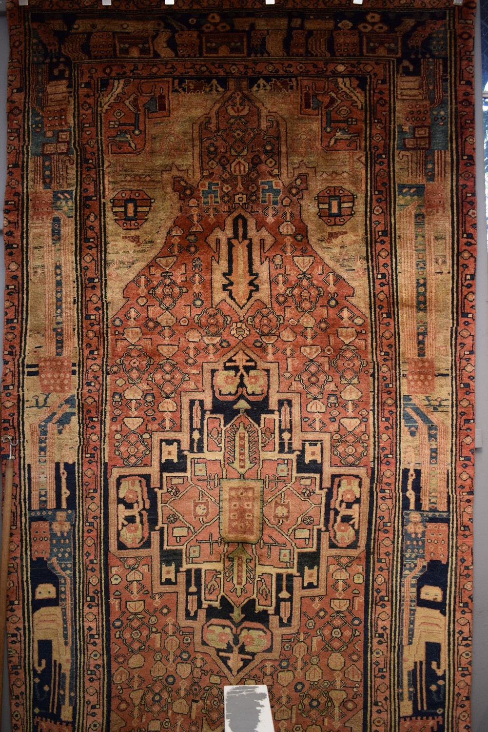 A MAGNIFICENT CIRCA 1970s TRIBAL PERSIAN NAHAVAND RUG. UNUSUAL & UNIQUE DESIGN. 100% HAND SPUN WOOL, NATURAL DYES. RARE AND COLLECTABLE. FINELY HAND-KNOTTED VILLAGE WEAVE WITH RARE DESIGN OF BOLD STYLIZED MEDALLION SET WITHIN A FIELD OF VARYING TRIBAL MOTIFS & BIRD FORMS. BORDER OF GEOMETRIC PATTERNS. GALLERY EXHIBITED. IN EXCELLENT CONDITION. CERTIFICATE OF AUTHENTICITY INCLUDED. SIZE: 376X172CM ORIGIN: PERSIA - RRP: $4,900 (LEONARD JOEL DELIVERY SIZE: LARGE)