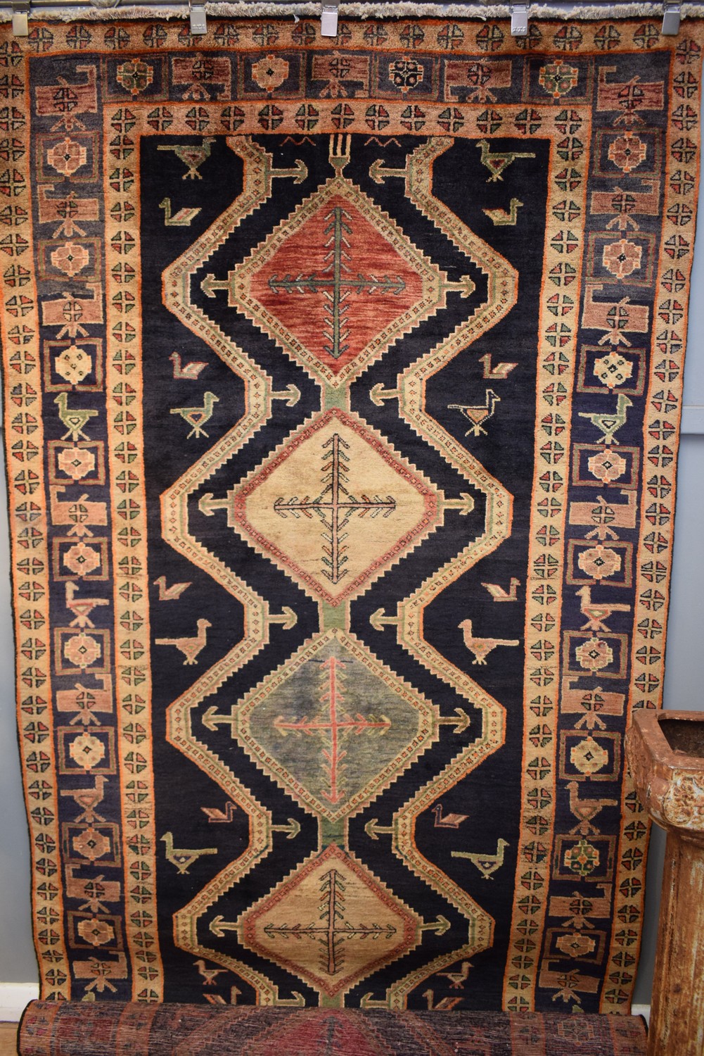 A PERSIAN SONQOR KOLYAIE RUG. 100% DENSE WOOL PILE. EX GALLERY. FINELY HAND-KNOTTED VILLAGE WEAVE FROM THE KURDISTAN REGION WITH TRIBAL DESIGN OF POLE ANCHORED HEXAGONAL MEDALLIONS CONTAINING TREE OF LIFE ON AN ALL-OVER BLUE TONED FIELD WITH BIRD LIFE. BEAUTIFUL MUTED COLOURS. BORDER OF GEOMETRIC PATTERNS AND BIRD FORM. SIZE: 313X150CM ORIGIN: IRAN - RRP: $3,300 (LEONARD JOEL DELIVERY SIZE: LARGE)