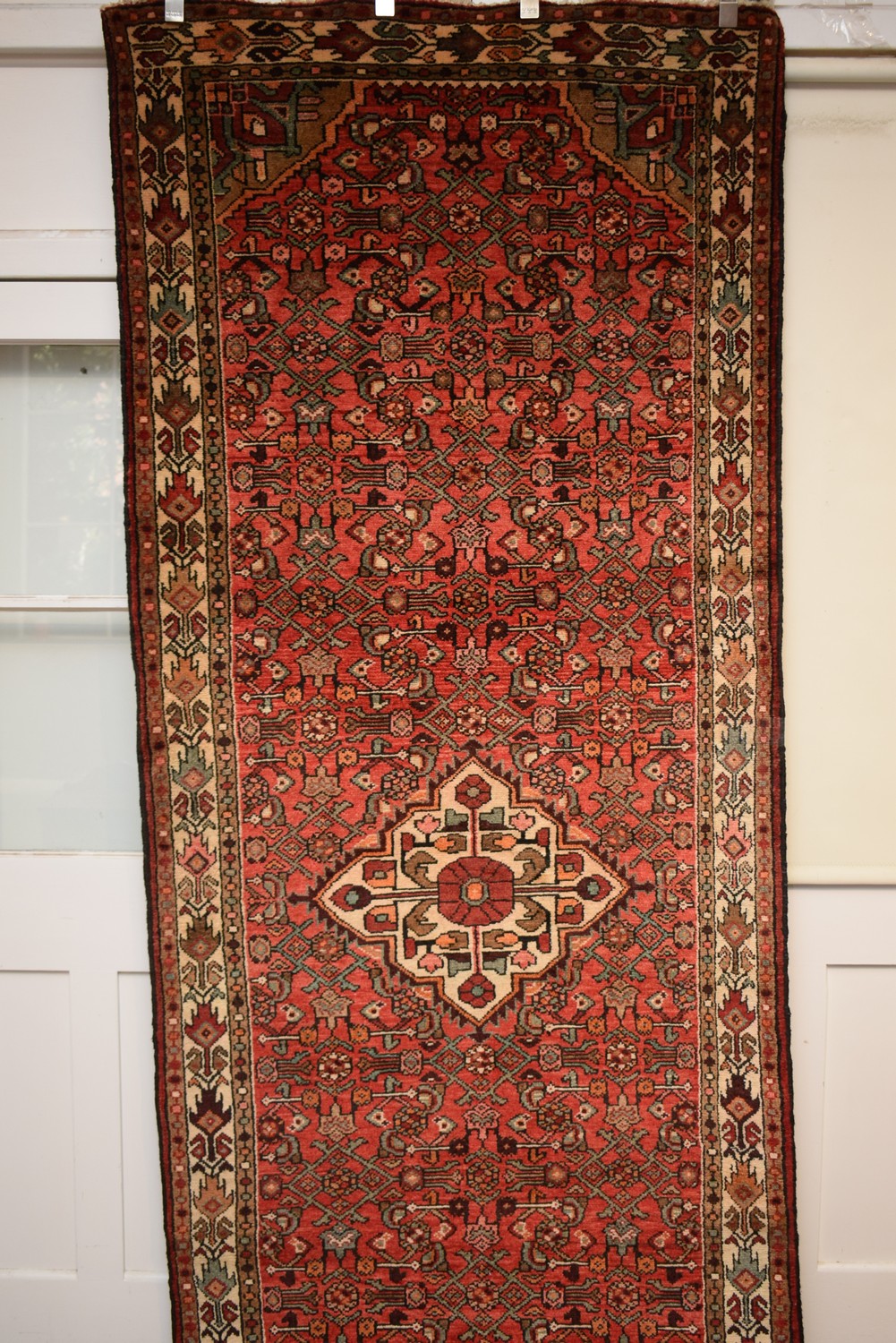 A PERSIAN HOSSAINABAD WIDE RUNNER. 100% WOOL. SOLID & DENSE PILE. MODERN CENTRAL MEDALLION, HAND-KNOTTED VILLAGE WEAVE FROM THE HAMADAN REGION WITH TRIBAL DESIGN OF ALL-OVER BOLD HERATI MAHI PATTERNS IN A RED FIELD. SOLID & HARD-WEARING. GALLERY INVENTORY. IN EXCELLENT CONDITION. CERTIFICATE OF AUTHENTICITY INCLUDED. SIZE: 320X120CM ORIGIN: PERSIA - RRP: $2,900 (LEONARD JOEL DELIVERY SIZE: LARGE)