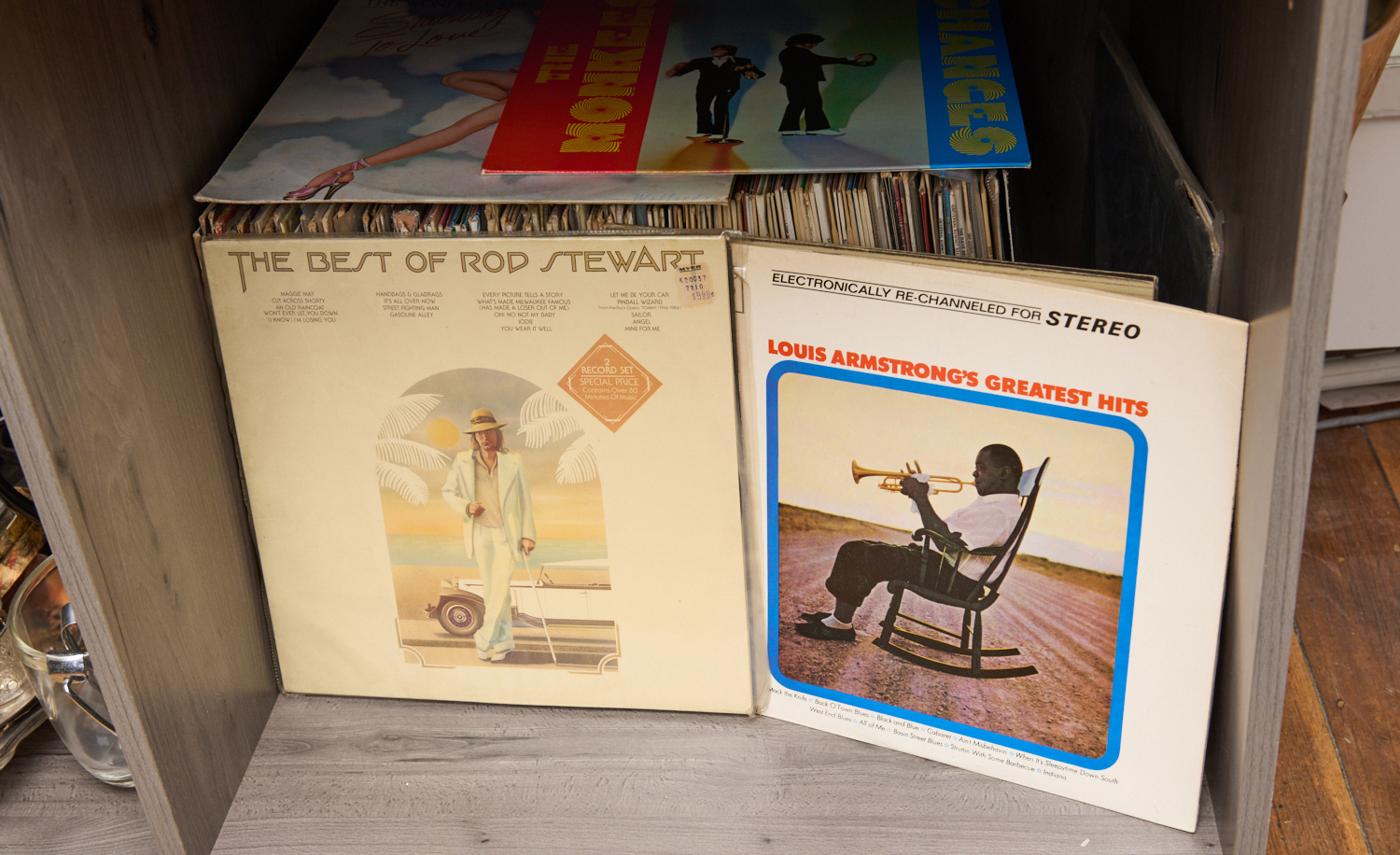 A SHELF OF ASSORTED VINYLS INCLUDING LOUIS ARMSTRONG, ROD STEWART, ELTON JOHN AND GLENN MILLER, LEONARD JOEL LOCAL DELIVERY SIZE: MEDIUM
