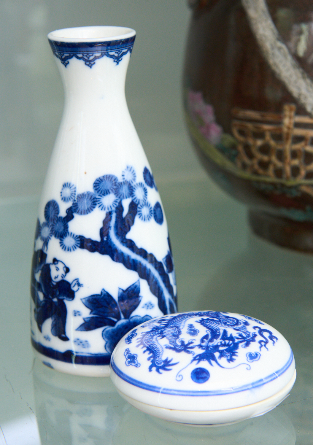 A BLUE AND WHITE CHINESE VASE TOGETHER WITH A TRINKET BOWL H.15CM, LEONARD JOEL LOCAL DELIVERY SIZE: SMALL