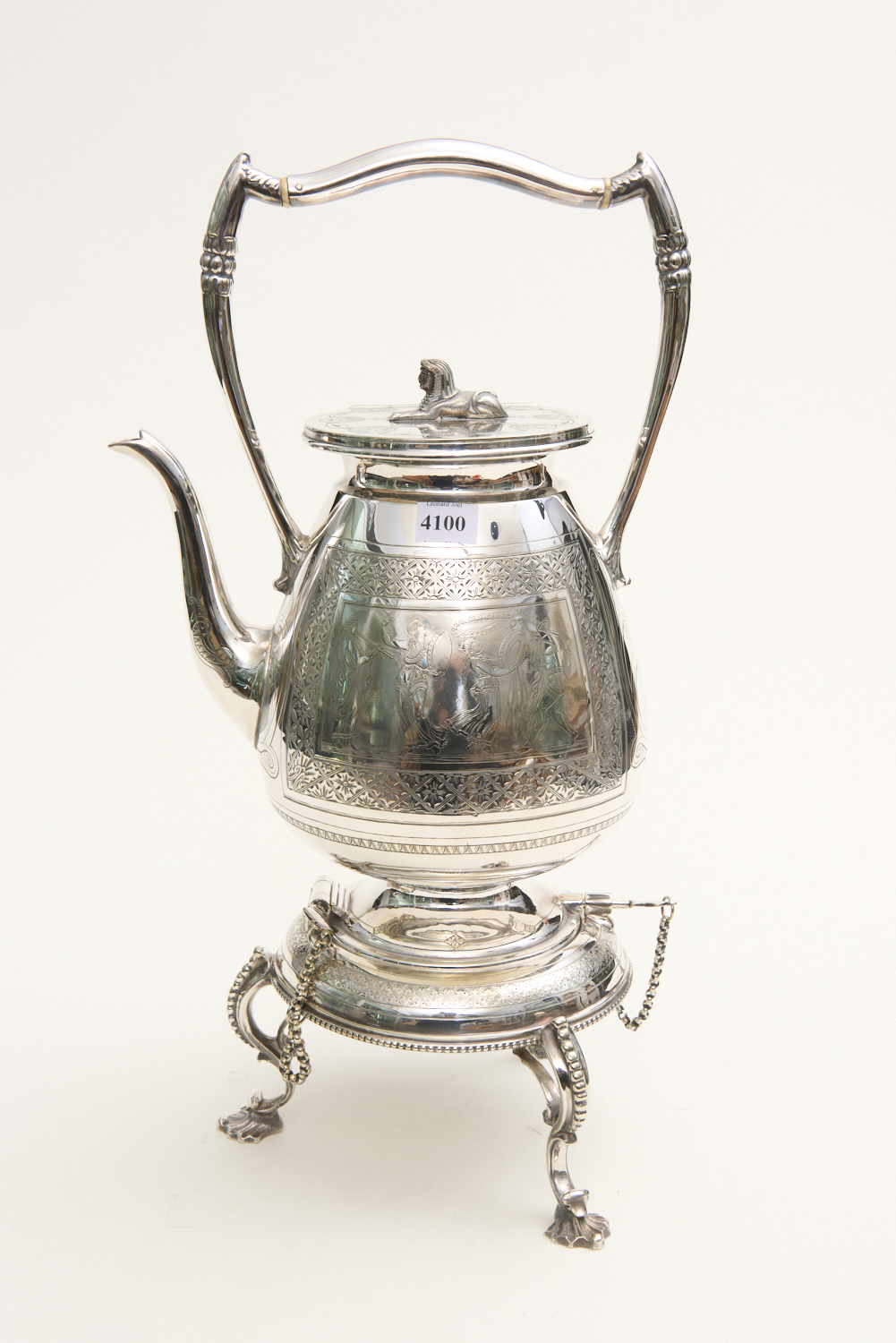 A SILVER PLATE SPIRIT KETTLE WITH EGYPTIAN MOTIF H.47CM, LEONARD JOEL LOCAL DELIVERY SIZE: SMALL